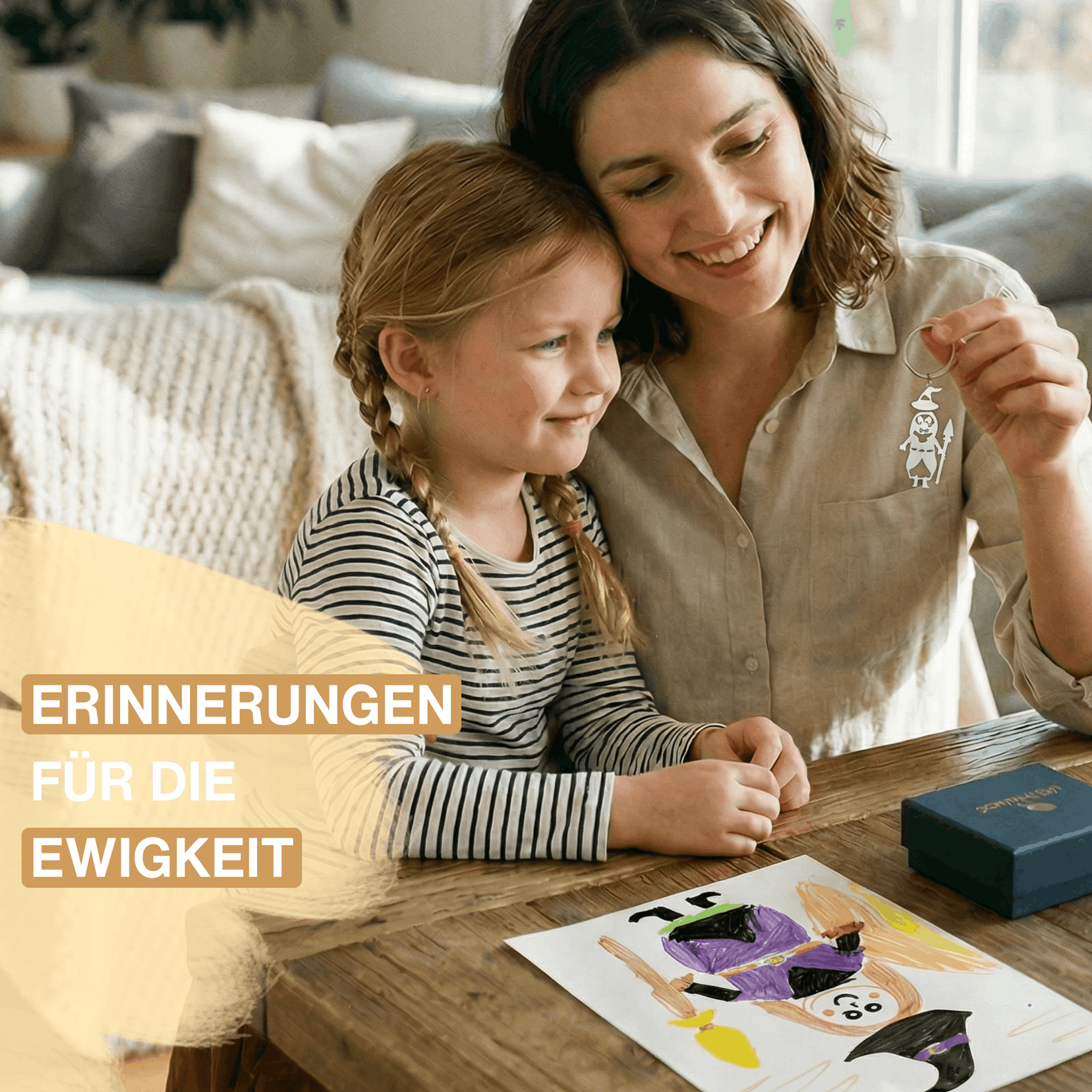 Die ersten selbstgemalten Bilder der eigenen Kinder sind für Eltern etwas ganz besonders. Wir verewigen die kleinen Kunstwerke zu wundervollen Schlüsselanhängern.